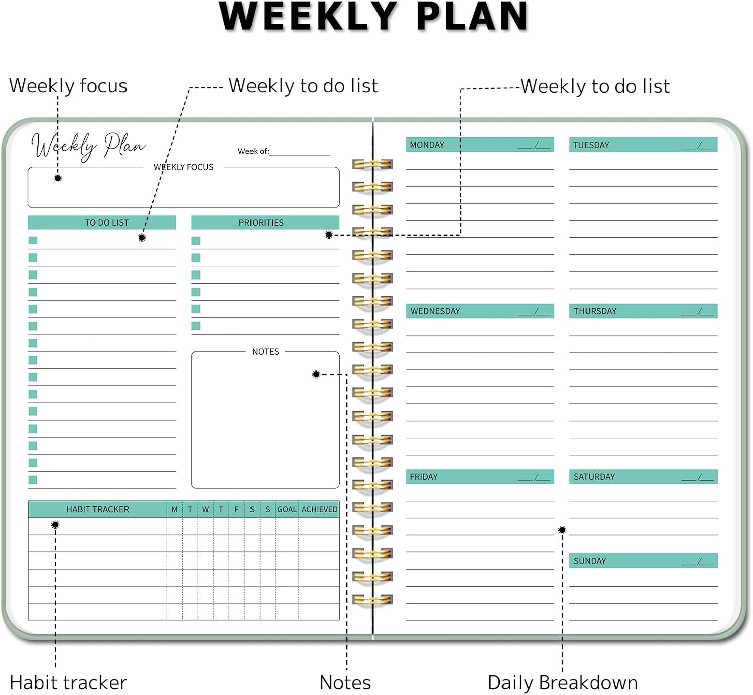 Weekly Planner – 57 Weeks Undated Daily Weekly To Do List Notebook with Goals & Habit Tracker, Spiral Binding Weekly Planner Notebook for Women & Men, Work and Home, 6.3″x8.5″, Green